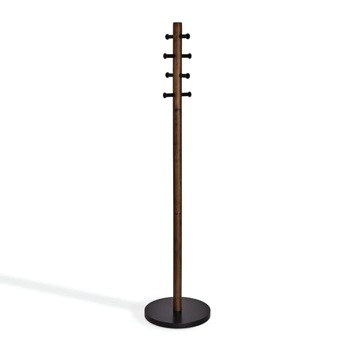 Pillar Is made of wood and metal. The coat rack from Umbra is available in different colours.