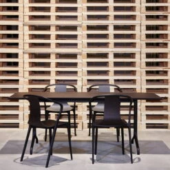 The chair offers more selection in colour and materials as wood, leather or fabric cover versions with appropriate seat shell and a frame made of deep black polyamide injection moulding. These versions are intended for indoor use only, where they set exciting accents in living rooms, gallery rooms as well as in cafés.