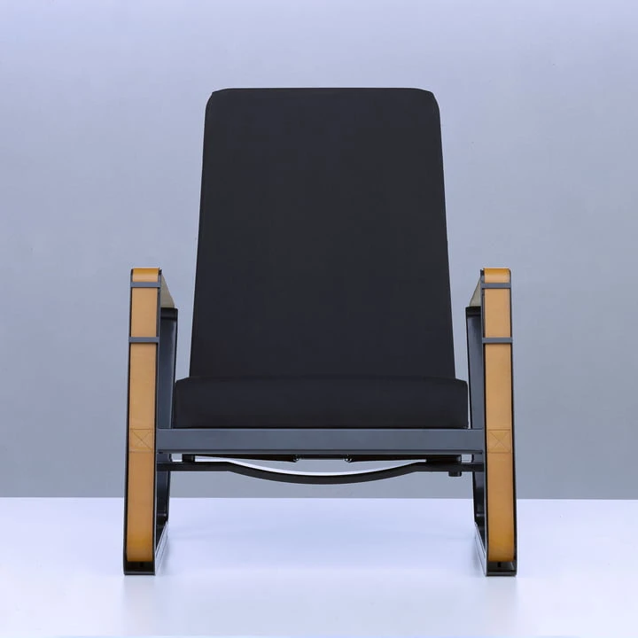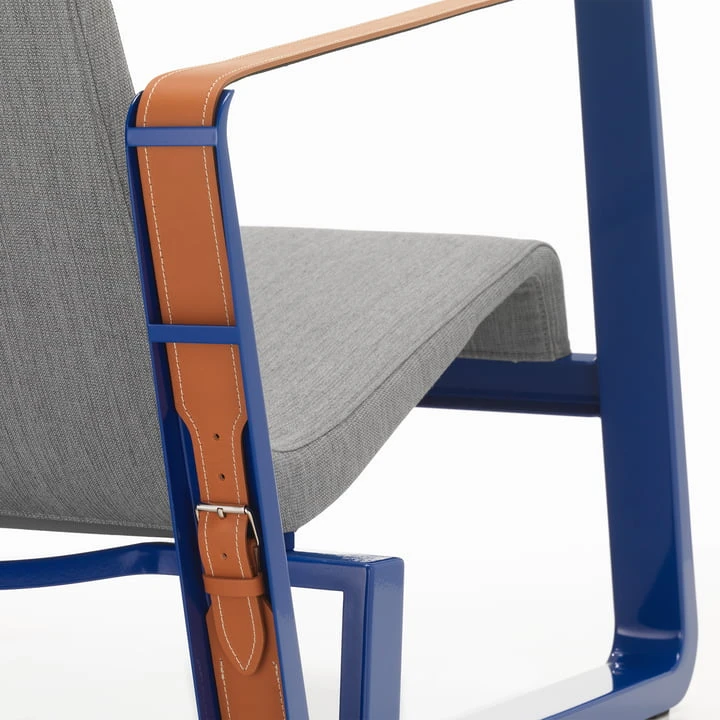 The armchair is characterized by its extravagant steel sheet skid frame, which is both armrest and feet. The frame is covered with a leather belt, which relativizes the hardness of the material and provides a harmonious overall ensemble.