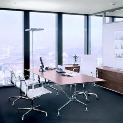 A characteristic feature of the Aluminium Chair is the intelligent combination of materials. The upholstery is fixed and freely tensioned in the lateral aluminum profiles. This means that the cover is not a shell, but becomes a load-bearing part of the construction. It adapts to the body and offers a high level of comfort, even without elaborate upholstery. In contrast to the other products of Aluminium Group , the EA 117 and EA 119 chairs have castors on the feet.