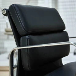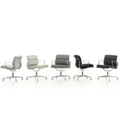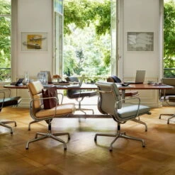 The office chair consists of a swivel four-star frame, side profiles and clamping brackets made of polished die-cast aluminum, chrome-plated or deep black powder-coated. The armrests are designed to match. The seat shell features a medium-height backrest. Three sewn-on cushion units with polyurethane foam upholstery are available with covers in leather in a variety of colors. Thus, the chair adapts perfectly to any ambience and taste. Soft Pad Chair EA 208 is available in two different heights.