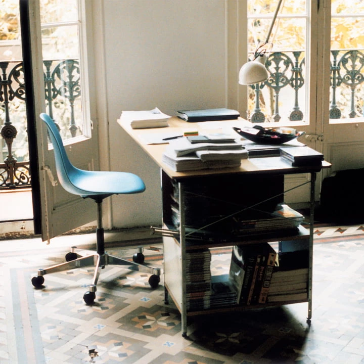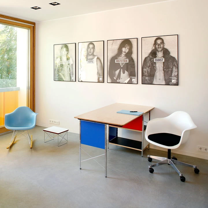 The Eames desk unit (EDU) by Vitra is a true design classic of the post-war period. In 1949, the designers Charles and Ray Eames developed a new system of freestanding, multifunctional desks that were constructed for the industrial series production.