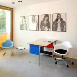 In collaboration with the Eames Office and Dutch designer Hella Jongerius a new edition of the desks came to life that, thanks to the carefully defined new colour scheme has a fresh and contemporary effect, but keeps the charm of the 1940s and 1950s. The colour matching panels do not only serve the decorative aspect, but also shield and shade the two storage compartments. The frame is individually adjustable to compensate for any unevenness of the floor.