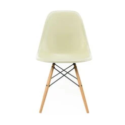 Der Eames Side Chair DSW ( D ining Height S ide Chair W ood Base) wurde 1948 von Charles und Ray Eames bei dem Wettbewerb ‚International Competition for Low-Cost Furniture Design‘ als Entwurf vorgestellt, gewann den zweiten Preis und ging nur wenig später in die Produktion. Die organisch geformte Sitzfläche wurde zunächst aus mit Fiberglasfasern verstärktem Polyesterharz gefertigt, das sich als besonders leicht formbar, komfortabel und angenehm in der Haptik erwies. Mit diesem für die Möbelindustrie neuem Material, gelang es den Designern, eine einzigartige Sitzschale im zeitlosen Design auf den Markt zu bringen.