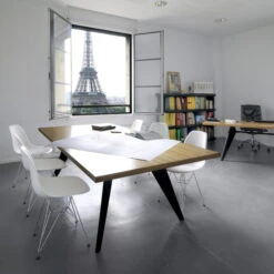 Since the EM Table has the same materials and design language of Jean Prouvé’s standard chairs, the French designer’s furniture can be perfectly combined.