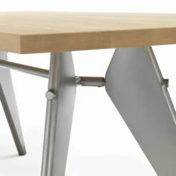 The diagonally attached, tapering legs give the EM Table a constructive dynamism and strength. A crossbar of round tubing connects the legs to create stability. The wooden tabletop contrasts the metal and makes the table look lighter. The table produced today by Vitra EM Table is emblematic of Jean Prouvé’s design philosophy, which thrives on the combination of architecture, technology and craftsmanship.