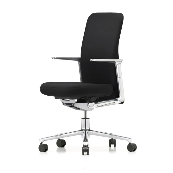 The office chair is made of a stable five-star base made of polyamide or aluminium in polished or black with castors. The upholstery of the seat and backrest is made of polyurethane foam and can be covered with fabric or leather in a wide range of colours.