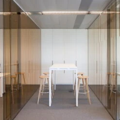 Vitra manufactures the Prouvé-typical, tapered legs and the seat of the Tabouret barstool in solid oak wood. The stool is available in two variants: in natural wood or in stained dark wood. The footrest consists of powder-coated steel, also Prouvé-typically making an aesthetic virtue out of a necessary part of the construction.