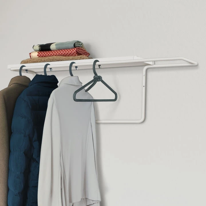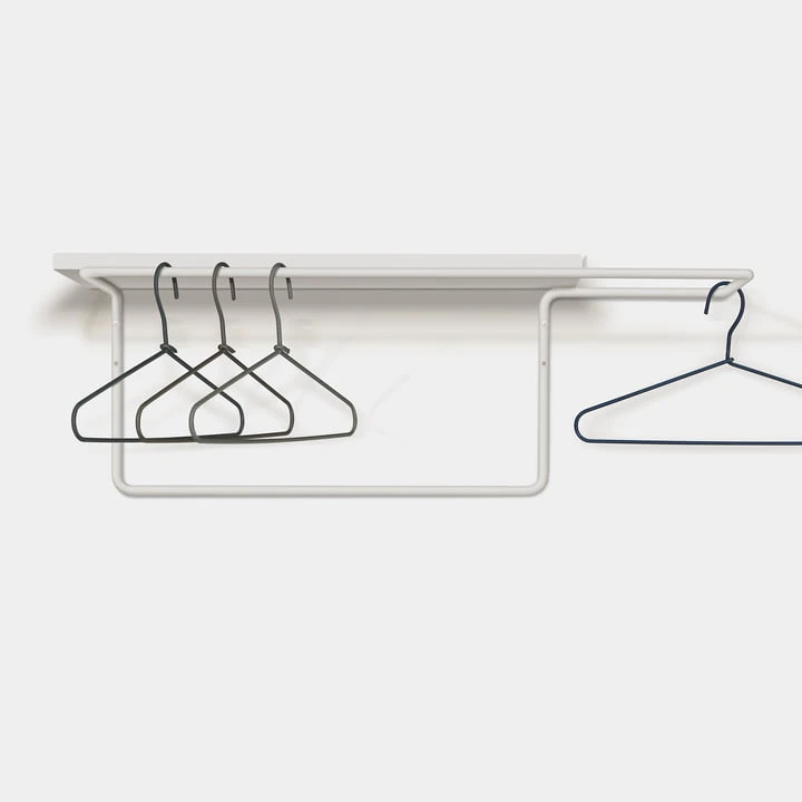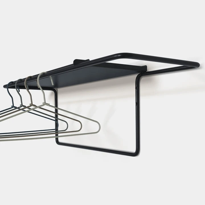 While coats and jackets can be hung up on the rounded coat hangers, a shelf made of powder-coated steel provides space for hats, bags or scarves. The wire wardrobe designed by Martin Hirth can also be used as an alternative clothes rail in the bedroom, providing a clever way to store clothes in a space-saving manner.