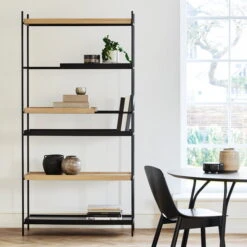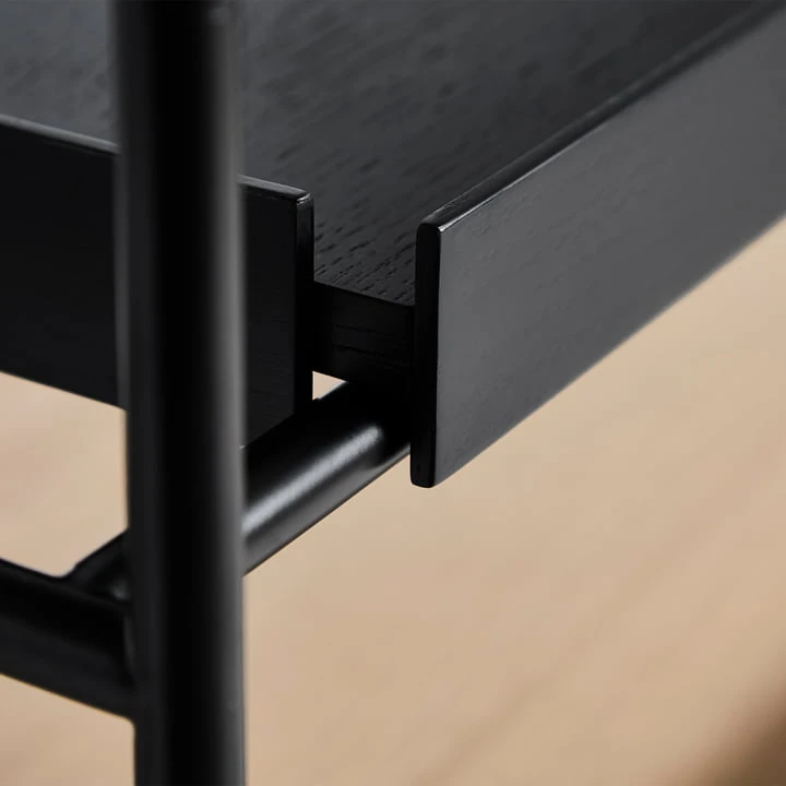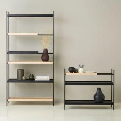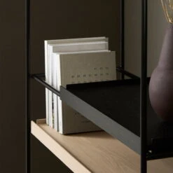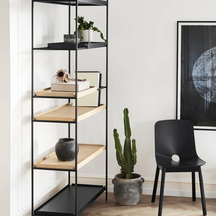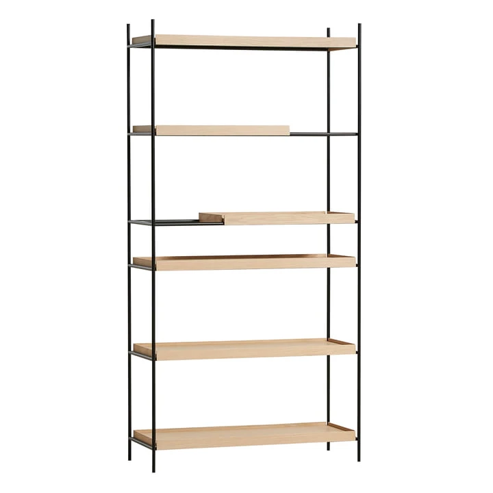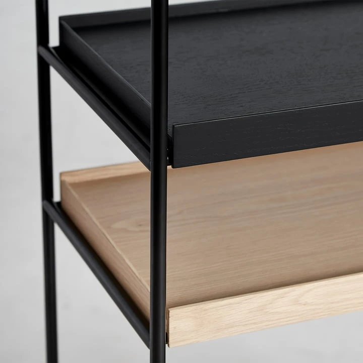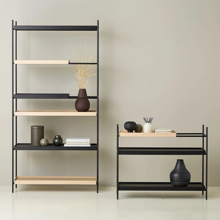 The Tray Shelf from Woud was designed by Hanne Willmann and is a flexible shelving system with sliding shelves. Each Tray Shelf consists of a framework made of steel. The shelves are made of oak wood. Depending on the size of the shelf, Tray has one short or several long shelves that can be moved as desired.