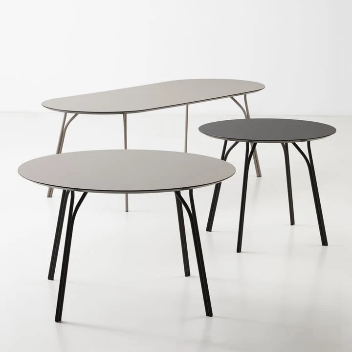 The legs of lacquered steel are reminiscent of the branches of a tree, which first rise next to each other before separating to support the tabletop in several places. The round shape of the table top invites you to a cosy dinner and conversations with family and friends.