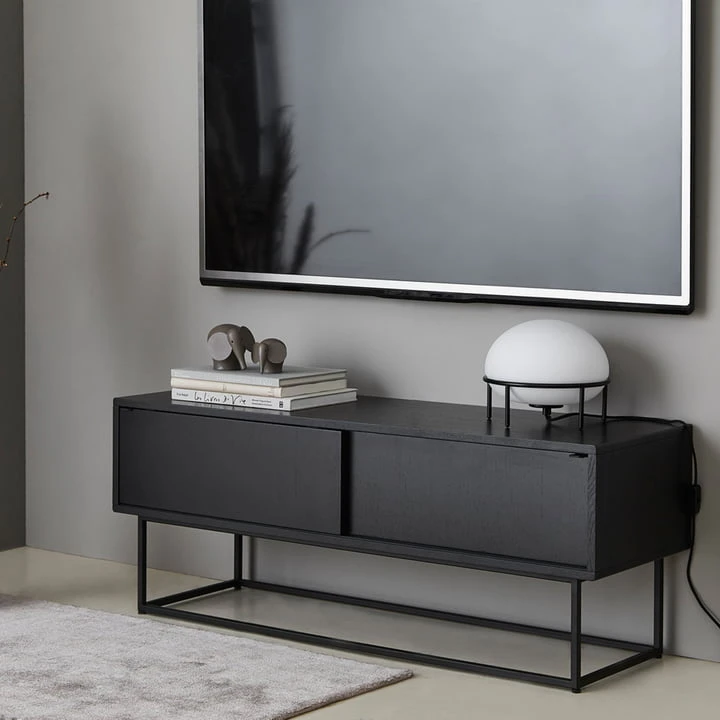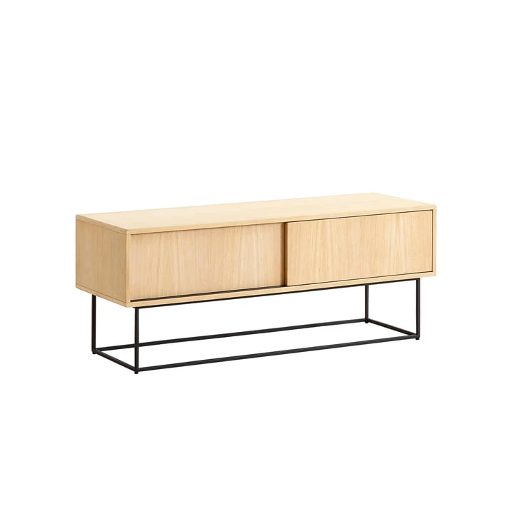 The geometric silhouette of oak veneer is supported by a filigree metal base, which gives the lowboard, despite its cubistic form a filigree charm. The cabinet element of the Virka Lowboard s is closed by two sliding doors, behind which books can be hidden as well as media and audio equipment. Thanks to the openings at the back, cables can be easily fed through and connected to the socket.