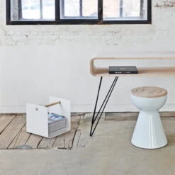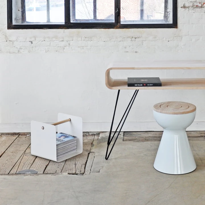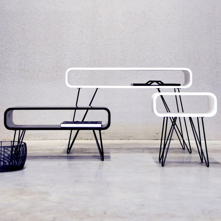 While the voluminous body shape of the Metro Sofa Table inspired by the design of the 50s and 60s, the four slender metal legs give the overall appearance an unmistakably modern accent. The tabletop, however, not only offers a unique look, but is also a rounded hollow body, the interior of which provides storage space for magazines and books, snacks, games and small accessories.