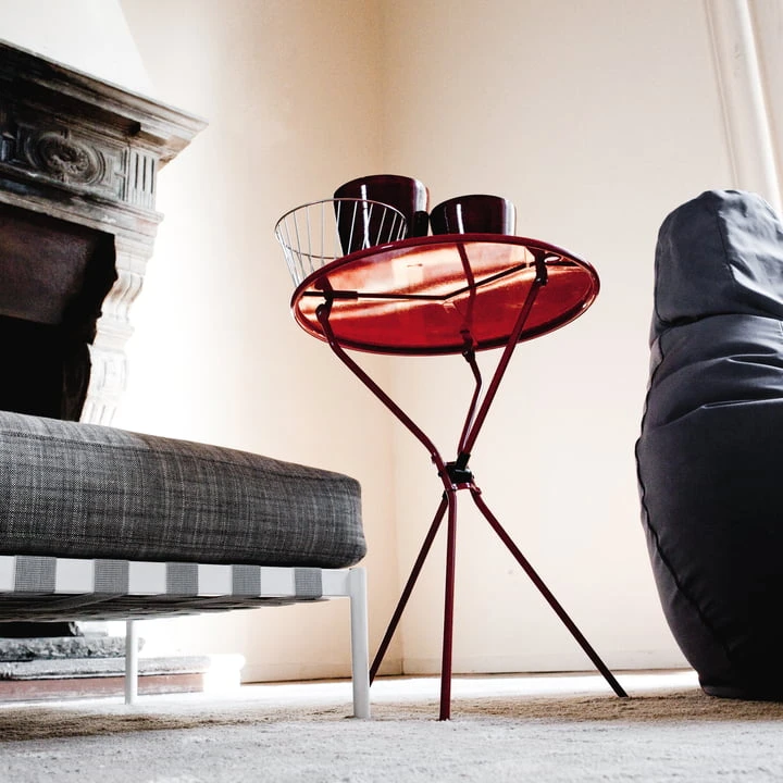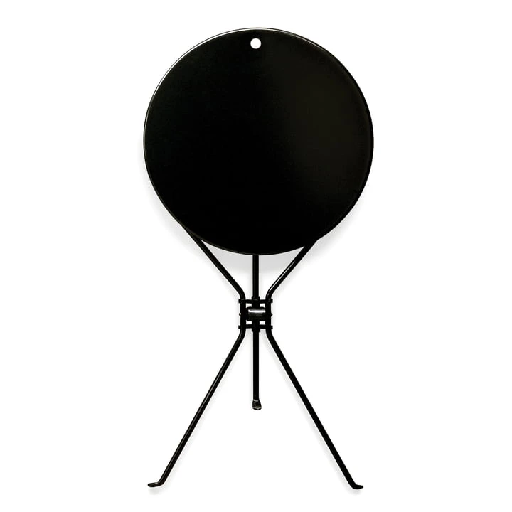 The practical Cumano side table by Zanotta is made of a round-steel frame and a round table top of painted metal sheet, which is available in different colours. Something special of the Cumano side table by Achille Castiglioni is the small hole in the table top, with which the side table can be hanged at a wall – and another special thing is the ability of being folded, of course. These are the reason why the Cumano side table by Achille Castiglioni is a succeeded example for mobile design.